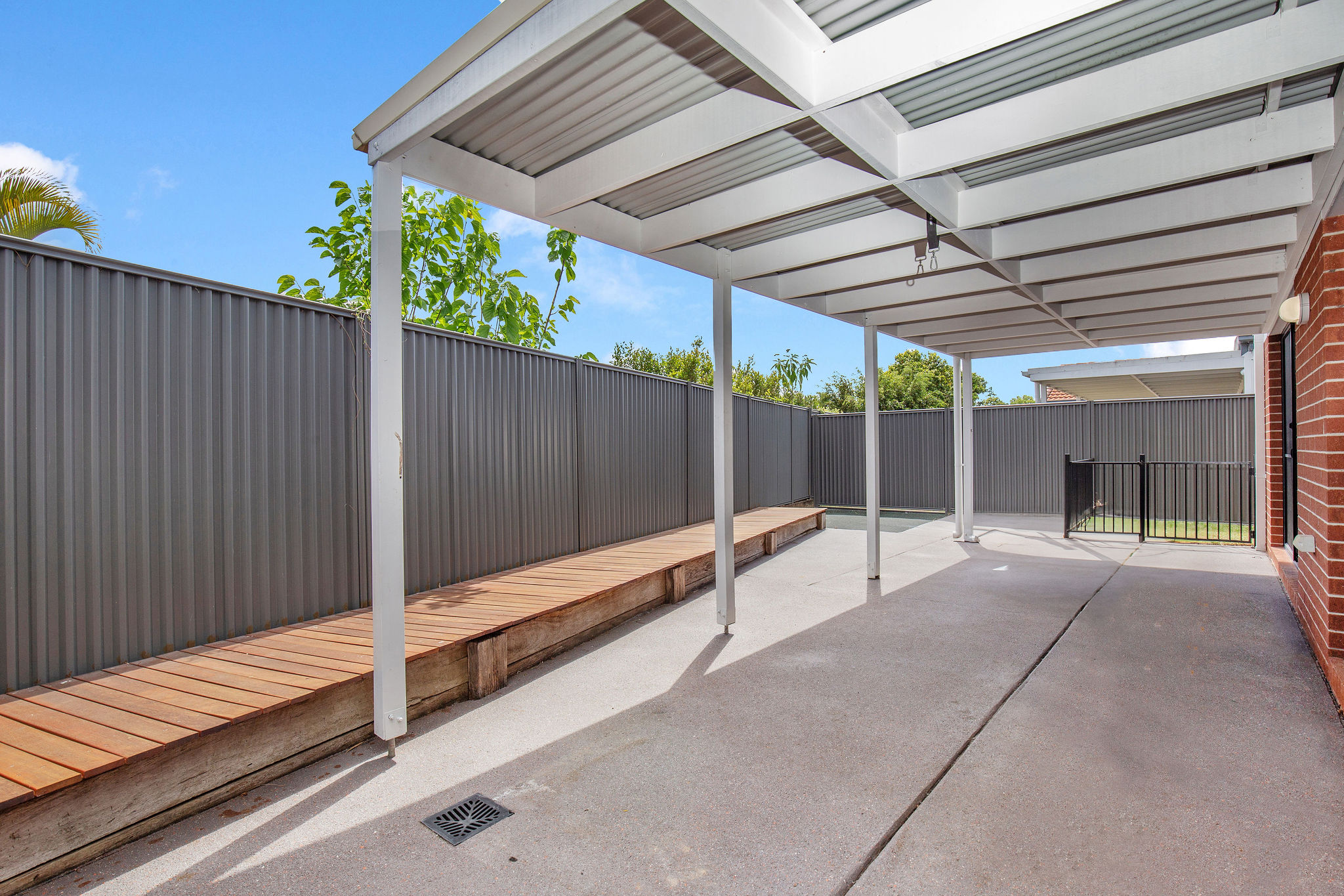 - Covered outdoor area with inbuilt timber bench seating – perfect for summer BBQs